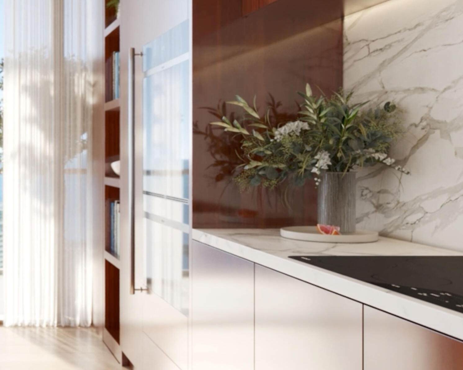 All Luxury condos in Casa Cipriani include generous living areas with ceiling heights of 10 feet, floor-to-ceiling sliding glass doors and windows with magnificent panoramic views, terrace access from the living room and primary bedroom of every residence, gracious walk-in wardrobes in every primary bedroom, an exquisite selection of flooring options included, direct elevator entry for select residences, eat-in, open kitchen with custom Italian cabinetry inspired by Cipriani’s renowned style, top-of-the-line appliances from Wolf Sub-Zero, including cooktop, integrated refrigerator, freezer, wine cooler, and dishwasher, primary bathrooms with grand, stand-alone bathtubs and glass-enclosed showers; vanities with premium Italian cabinetry, imported stone tops, back-lit mirrors; separate room with water closet, spacious laundry rooms with full-size washing machine and dryer, with a utility sink in most residences, central air conditioning and heating systems, innovative smart technology infrastructure